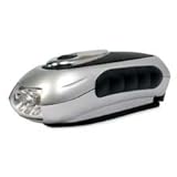 Windup, three-beam LED flashlight does not run on batteries. Simply wind up or pump the handle for light when you need it. Flashlight has a two-position switch for high and low beams.