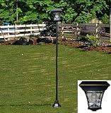 This solar lamppost light features a handsome traditional look, an ornate floral finial accent and cutting-edge designed framework with decorative beveled plexiglass. This low voltage light system features two large solar panels on top to recharge three Ni-Cad rechargeable batteries that power 4 large super bright LED bulbs housed inside a plastic frosted bulb which glows bright from dusk till dawn. The height of the fully assemble solar lamp post is 78 inches in height, or remove one of the poll sections to lower the unit for a fully assembled height of 62 inches, the base plate can be securely mounted to concrete or a even large pave stone with the included concrete expansion bolts. Simply find a location that receives sun during the day and you can have light at night with no additional electric bill! Perfect for lining a driveway, walkways, and patio or enhance your garden decor.