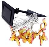 This 9 light string of flashing butterfly lights is solar powered. The string is over 20 feet long from the solar panel to the last light, but you can place the butterflies as close together as you want, due to the flexible wiring connecting them. They look great in bushes, around trees and along walls. The lights are super bright LEDs that flash on for 3 seconds, then off for 3 seconds. The solar panel comes with a ground stake, so you can place it in full sunlight.